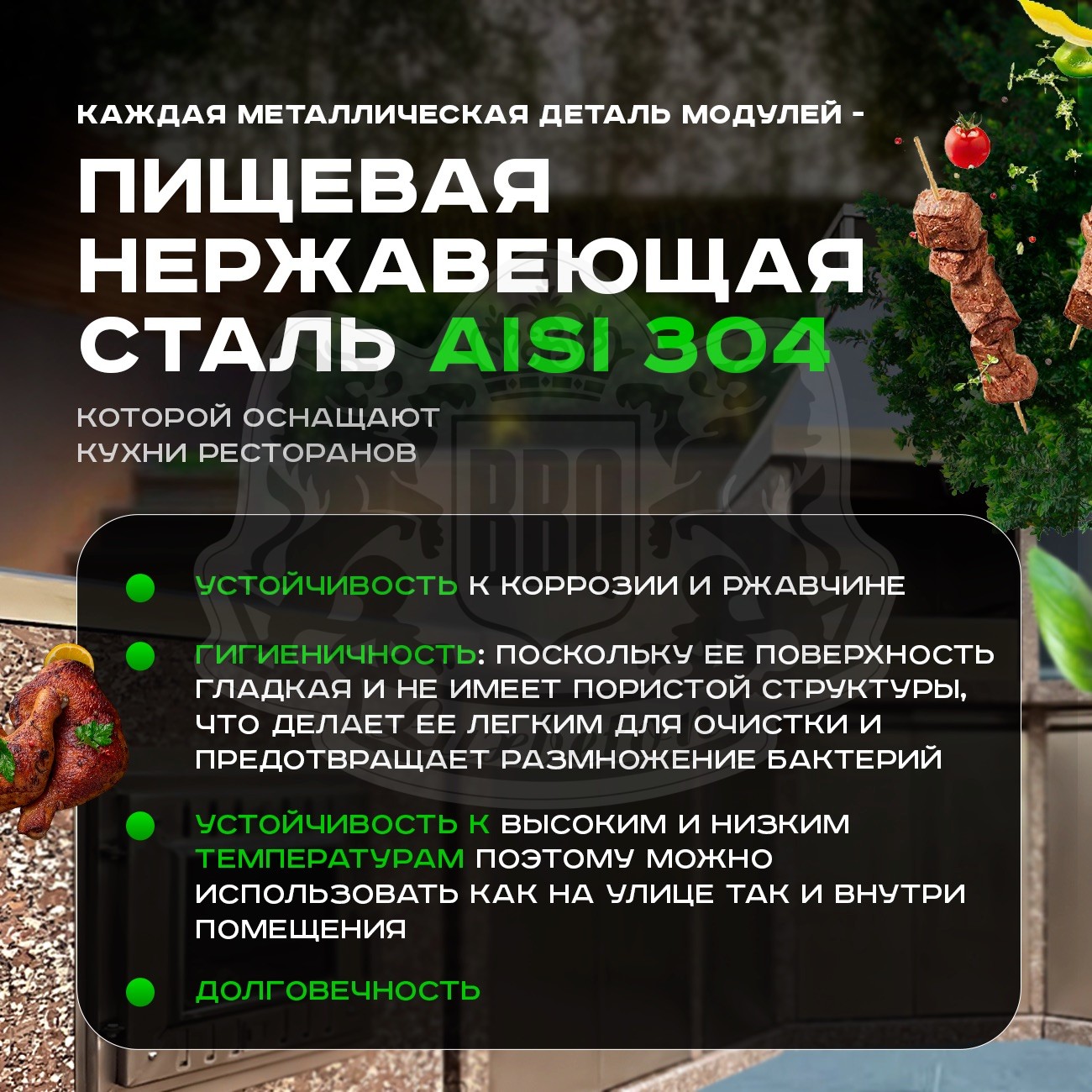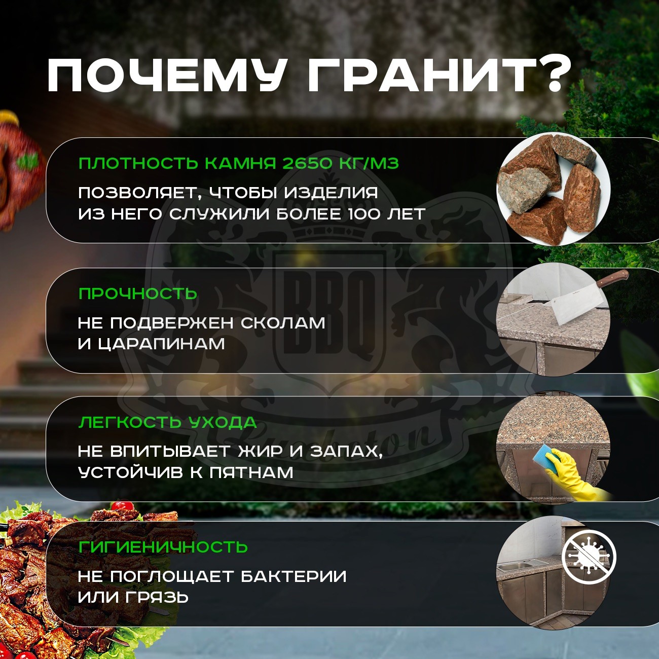 Гранит из которого сделан барбекю комплекс отличается своей высочайшей плотностью и прочностью, что позволяет ему служить вам на протяжении многих десятилетий. При этом материал не подвержен царапинам и не вбирает жиров, запахов, делая каждый модуль устойчивым к пятнам и чрезвычайно гигиеничным в эксплуатации.