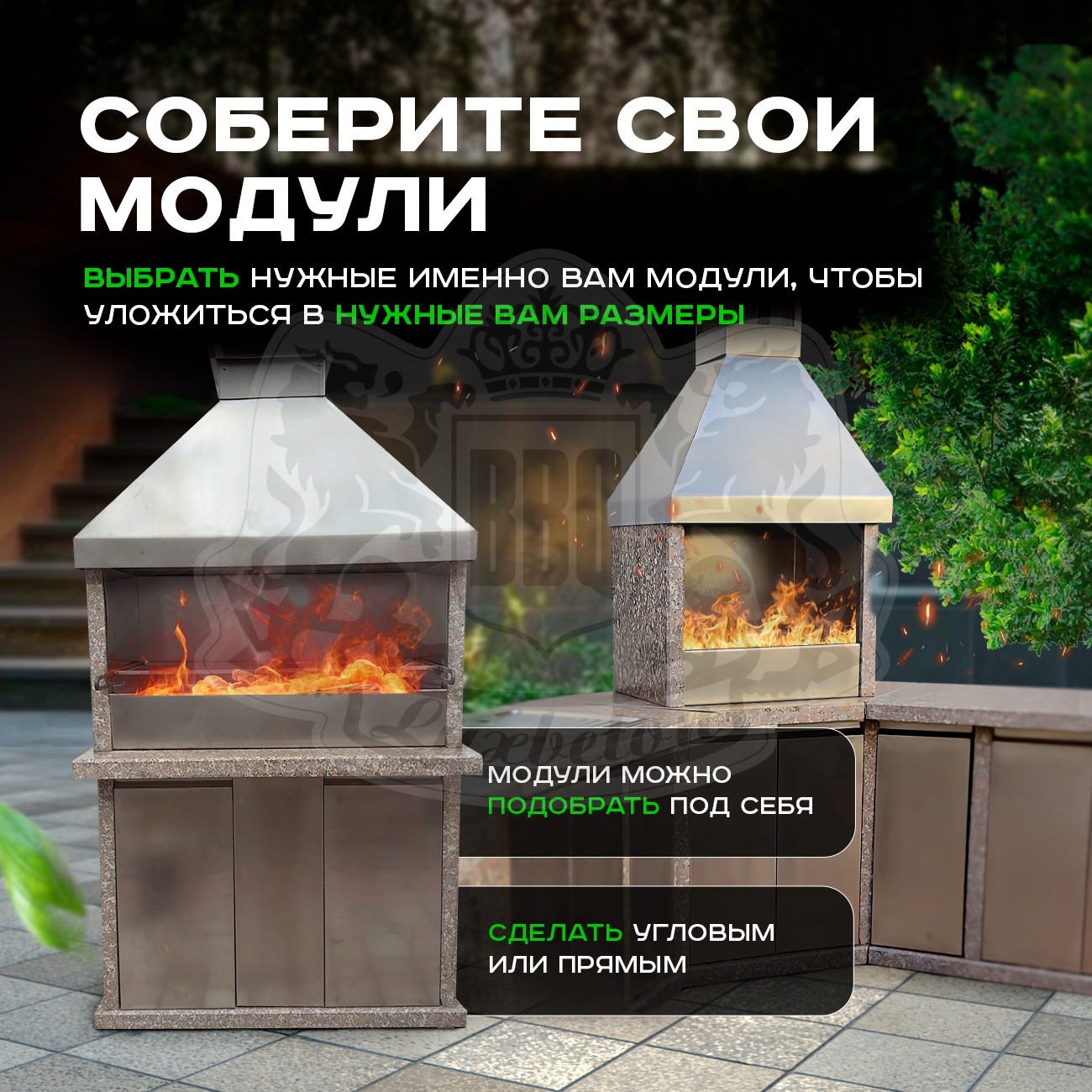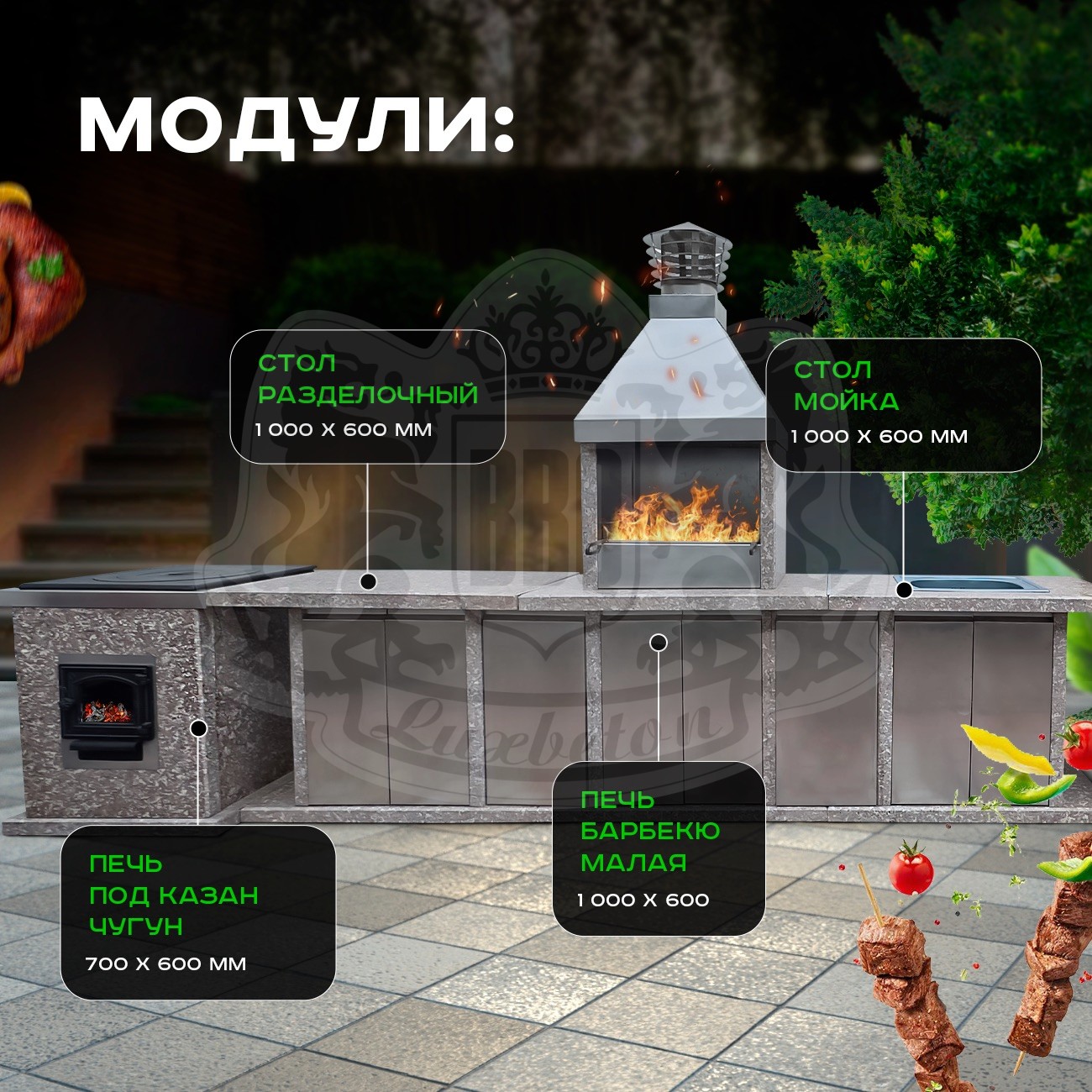 Модульная система гарантирует не только быструю сборку, но и устойчивость. Всего за час, можно собрать с помощью 2-3 человек и вы можете наслаждаться полностью функциональной барбекю зоной