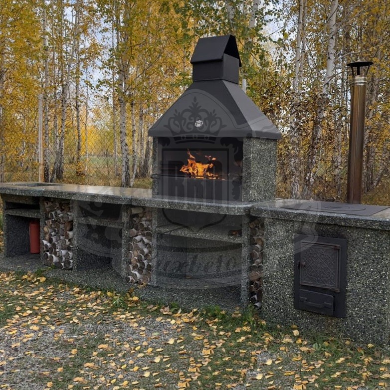 Интегрируя в себя четыре практичных модуля: мощную печь барбекю “Гранд” с топкой шириной 82 см, стол с роскошной каменной мойкой “Гранд”, разделочный стол 1100х700 мм и печь под казан, этот комплекс предлагает полную автономию приготовления пищи на открытом воздухе.