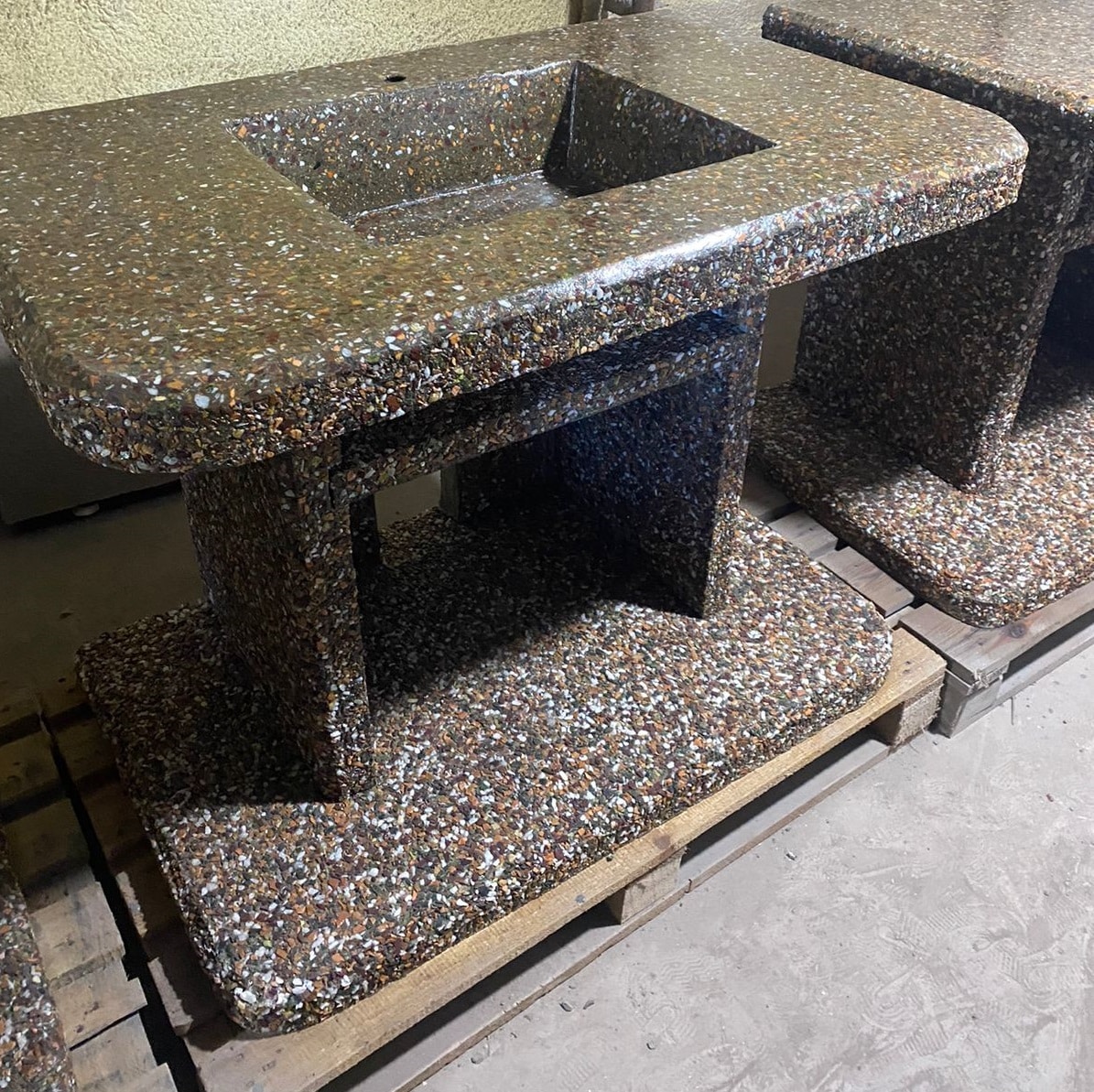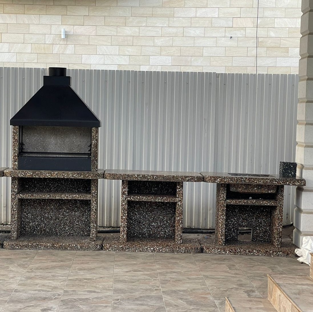 Стол с каменной мойкой «Гранд» (1100×700 мм) в фактуре «Горные цветы» — это гармония мрамора, яшмы, златолита, змеевика и кремния. Пестрый узор в оттенках зелени, золота и терракоты превращает стол в элемент природы. Идеален для тех, кто хочет добавить в барбекю-зону яркости и натуральности.Преимущества:✔️Глубокая раковина 490×390×150 мм — легко помыть решетку или крупные продукты.✔️Армированная столешница 7 мм + 3 слоя лака — защита от царапин, влаги и солнца.✔️2 полки под раковиной — всё для готовки под рукой.