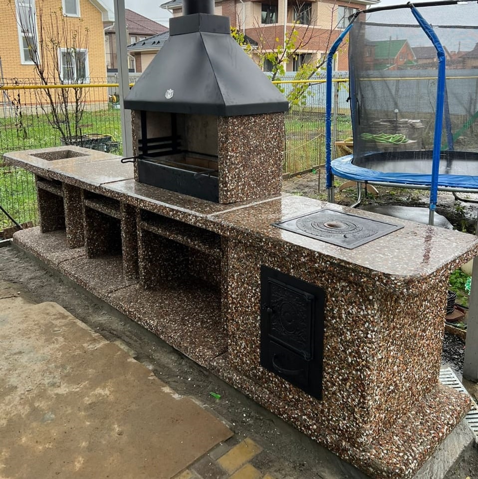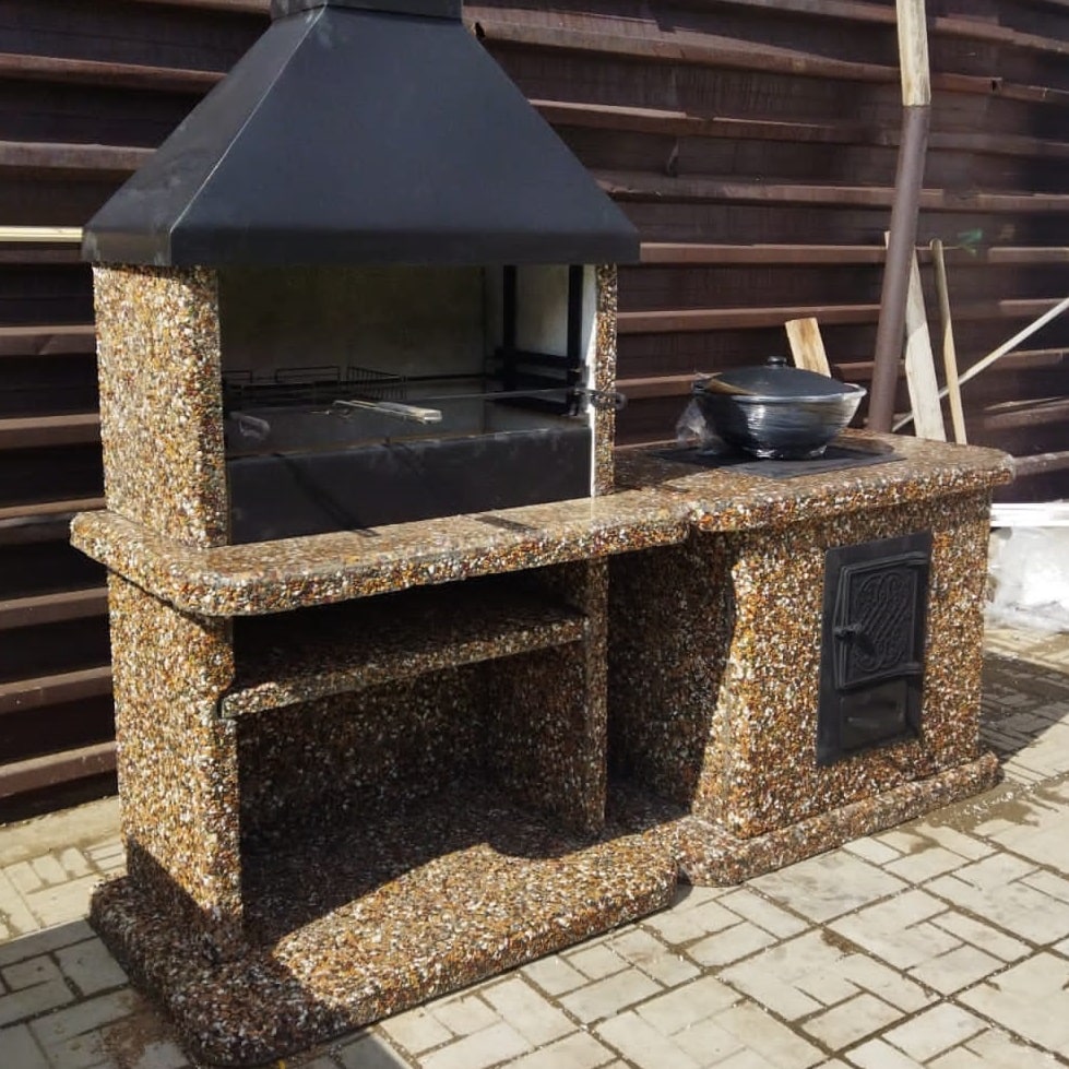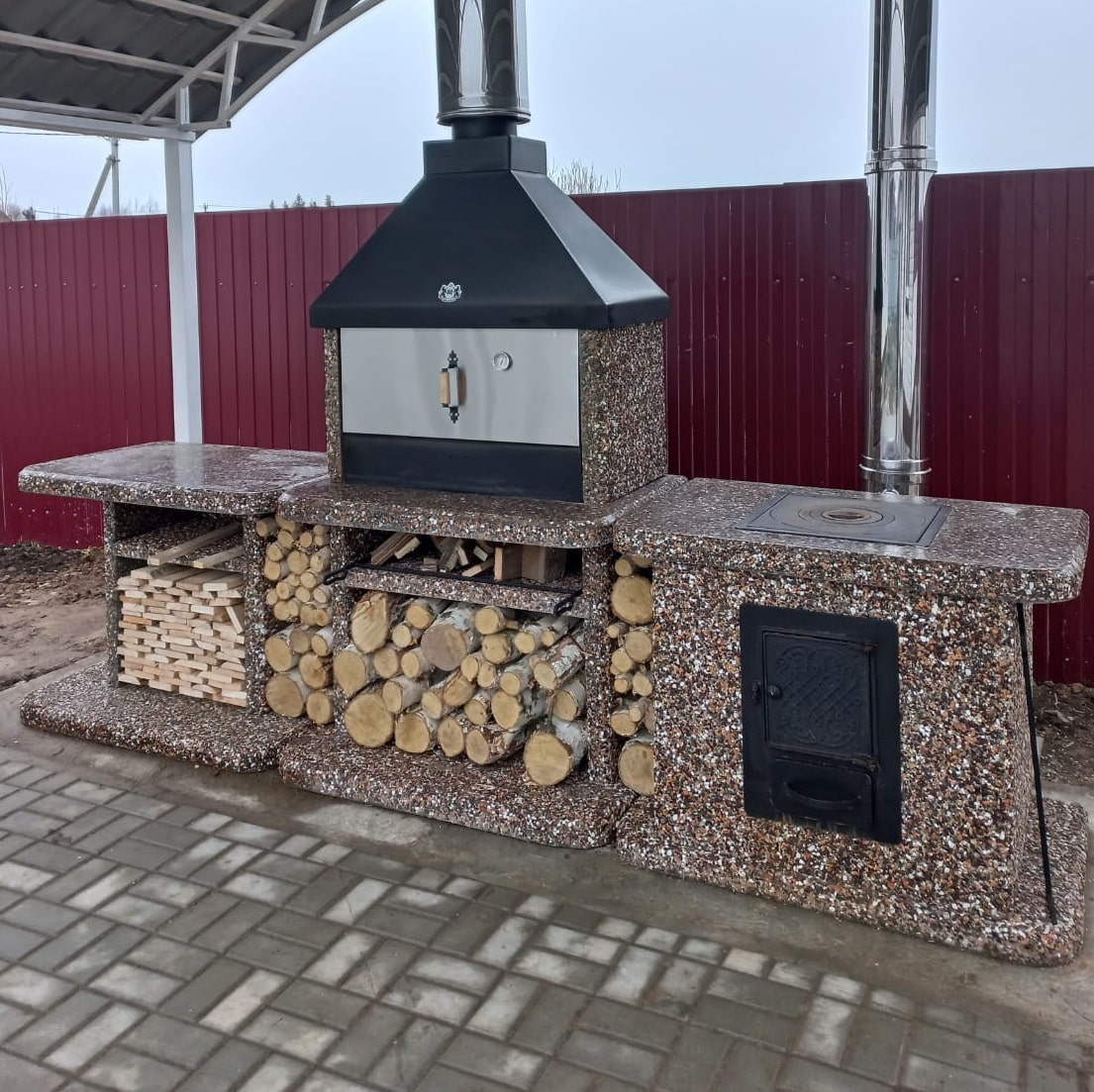 Печь под казан в фактуре «Горные цветы» — это барбекю из камня, созданное для идеального томления блюд. Многоцветная фактура (мрамор, яшма, златолит, змеевик, кремний) имитирует горный ландшафт, добавляя участку природный шарм. Модульная конструкция с чугунной плитой и зольником делает её универсальной для беседок, террас и кухонь.Преимущества:✔️ Равномерный жар — стальная топка СТ3 (4 мм) и 5 съёмных колец под казан до 16 литров.✔️ Безопасность — стенки не нагреваются даже при 1000°C.✔️ Простой уход — зольник упрощает чистку, а дымоход выводит дым через 200 мм трубу.