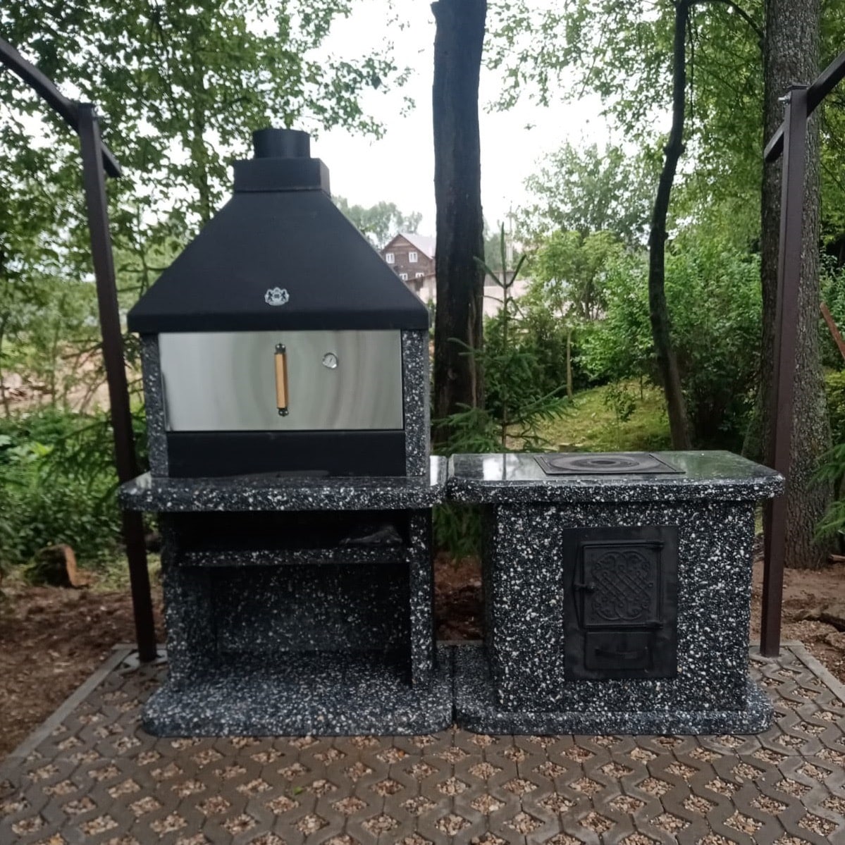 Создайте зону для шашлыка на даче добавив печь под казан в фактуре “”Ночное небо”” Габбро-диабаз и мрамор создают чёрно-белый контраст, а чугунная плита и зольник делают печь функциональной.Преимущества:✔️ Равномерное томление — благодаря металлической топке.✔️ Безопасность — можно ставить рядом с деревянными конструкциями.✔️ Габариты — 1100×850×700 мм (компактно для небольших участков).