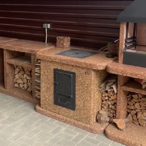 Печь для казана в фактуре «Золотая осень» — это тепло осенних вечеров. Златолит придаёт печи золотистый оттенок, а чугунная плита и зольник делают готовку удобной. Идеально для плова, томлёного мяса и ухи.Преимущества:✔️ Равномерный нагрев — благодая тому, что внутри модуля стальная топка с толщиной металла 4мм✔️ Простота монтажа — основание заменяет фундамент, собирается за час без опыта в стройке✔️ Вес 610 кг — устойчивая конструкция.