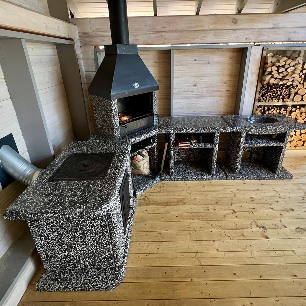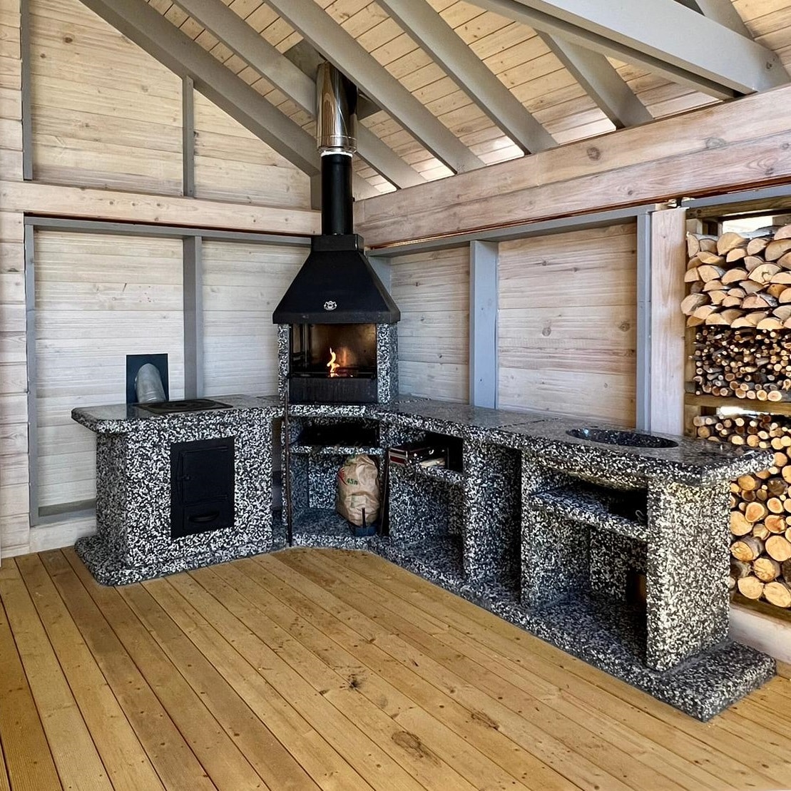 “Печь Барбекю из камня в фактуре «Черное-белое» — это классика контраста. Мрамор и габбро-диабаз создают строгий дизайн, а угловая конструкция экономит пространство.Преимущества:Фундамент-основание — не требует дополнительных расходов3 уровня жара — от томления до быстрой жарки.Сборка за 60 минут — технология шип-паз.